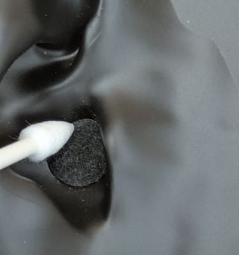 3.ポップガードの周辺部分を綿棒等で、押し付ける様に密着させて下さい。